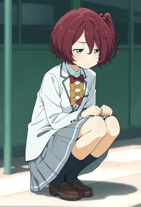 chika-default,komari chika,yellow eyes,red hair,hair over one eye,one side up, hair bobbles,school uniform,white jacket,bowties,long sleeves,grey skirt,black socks,loafers