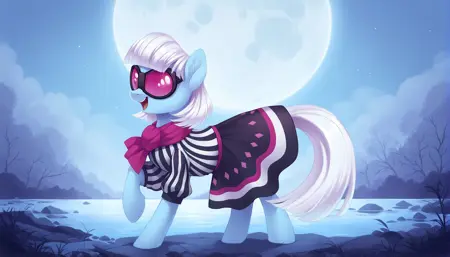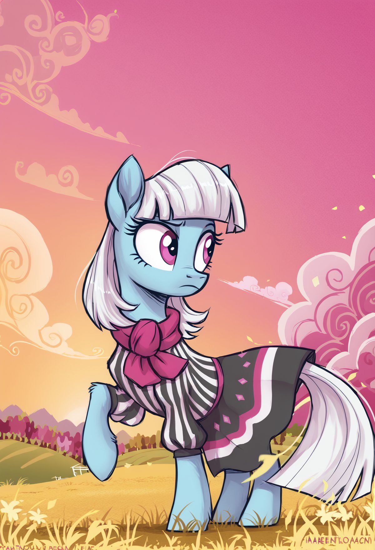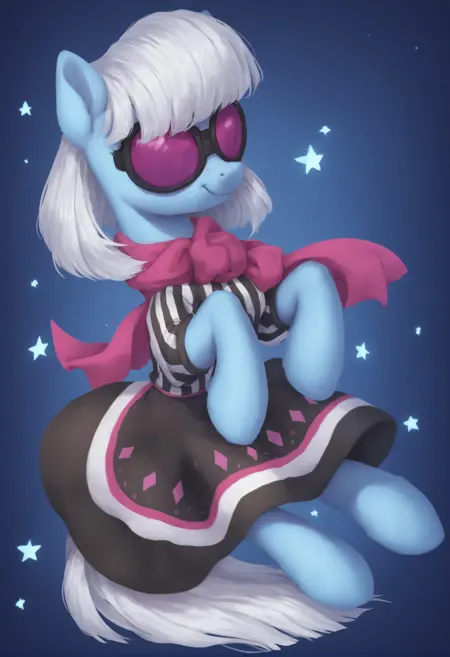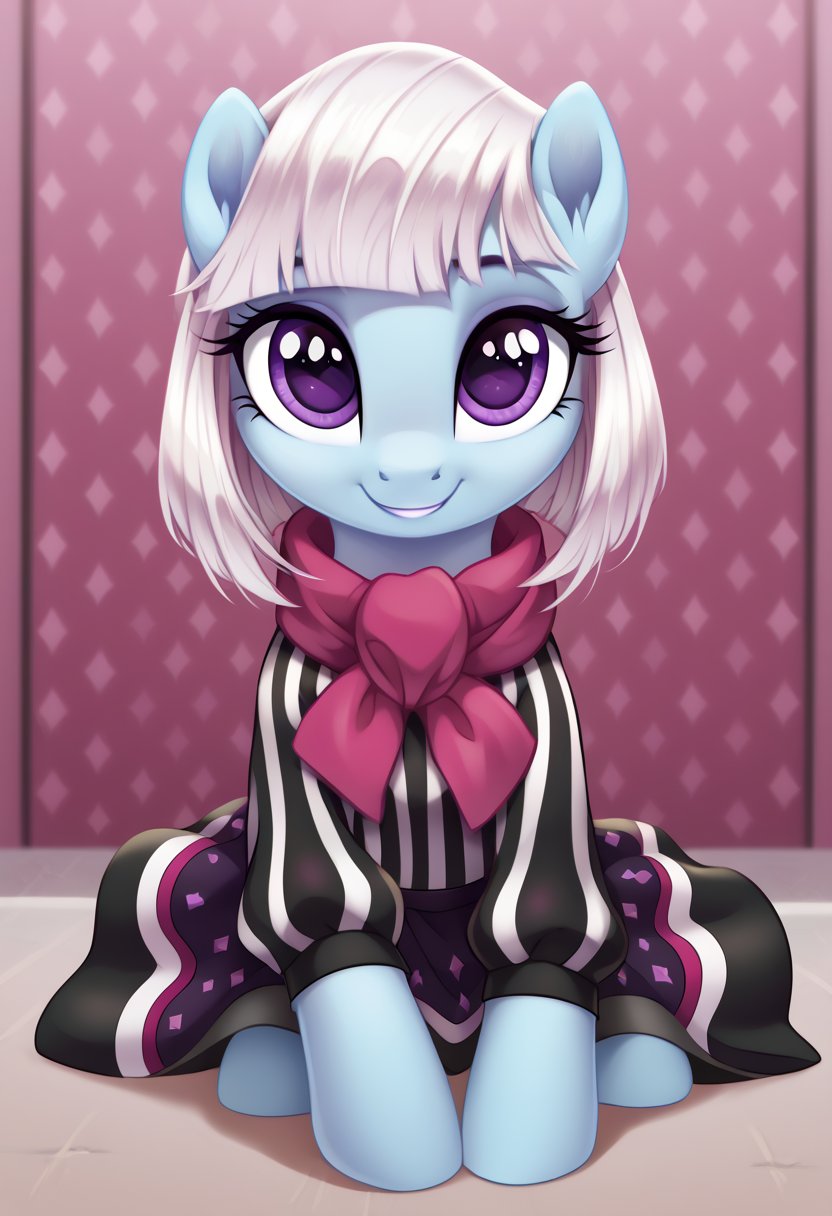 Clothes: black and white striped dress with a fluffy black skirt, Skirt with diamond patterns of white and pink, Under the skirt there is also a white stripe, then a pink one, large pink scarf