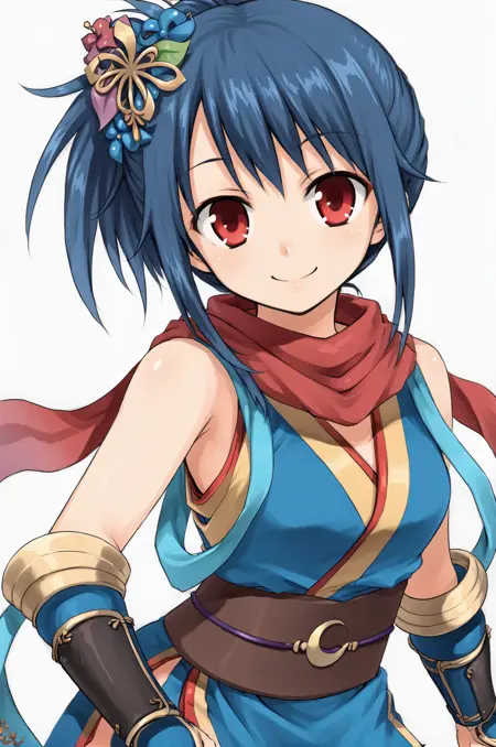 提示词:ninjaRO,露肩, turquoise sash,棕色腰带,红色围巾,蓝色短和服,护臂,无袖,露胸设计,护小腿,凉鞋,黑色过膝袜