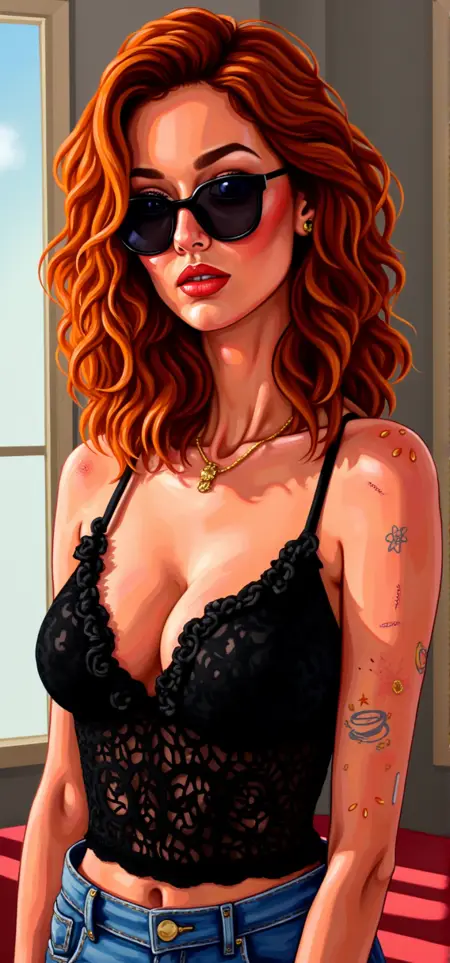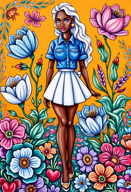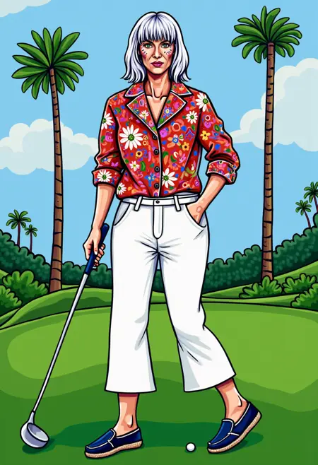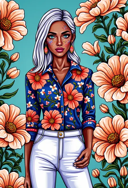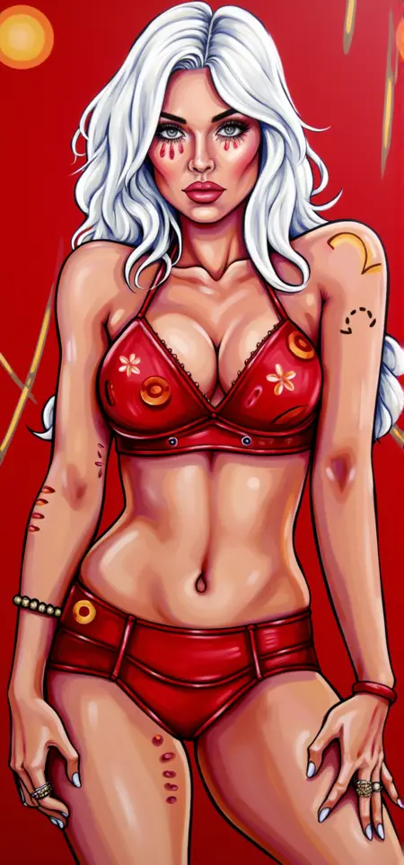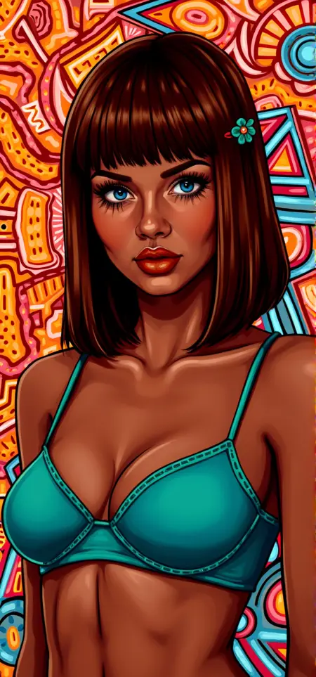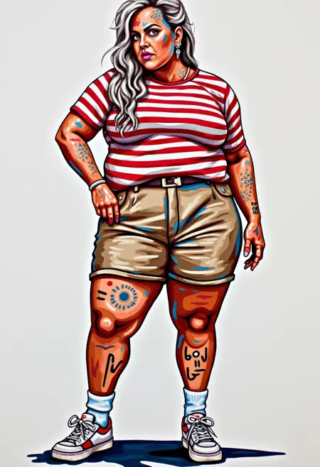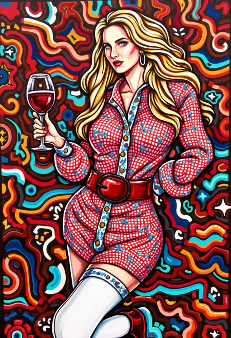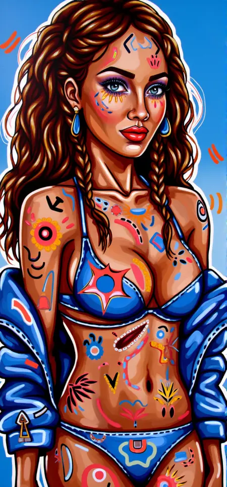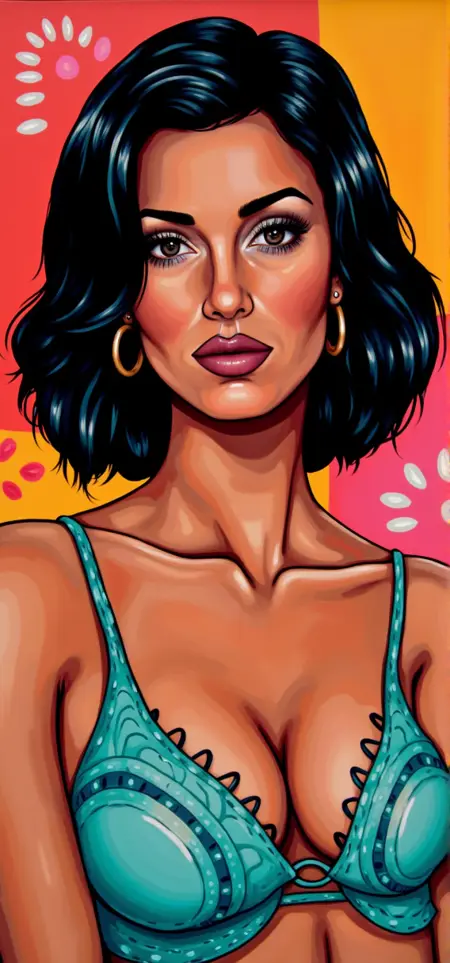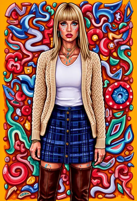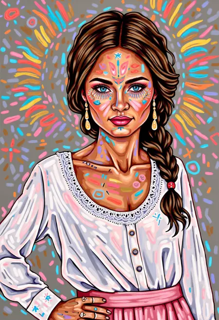 This image is a vibrant, stylized digital painting portrait featuring a depiction of YOUR PROMPT HERE. The artwork is executed in a bold, modern digital art style with a mix of bright colors, geometric pattern, bold lines abstract patterns and exaggerated features
