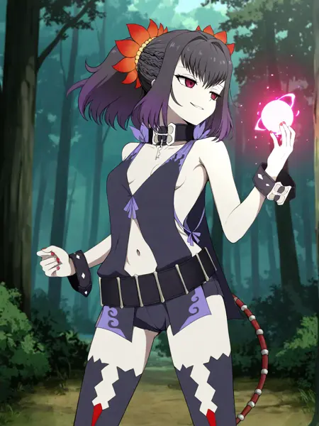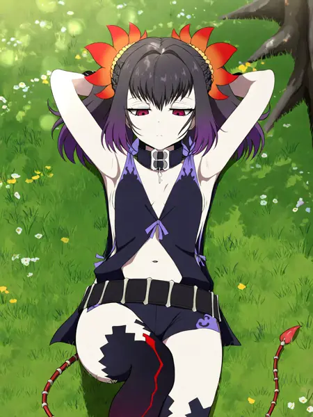 symonne \(tales\), black hair, purple hair, short hair, braid, red eyes, hair flower, hair ornament, pale skin, small breasts, choker, bracelet, short shorts, belt, revealing clothes, navel, tail, nail polish, black thighhighs