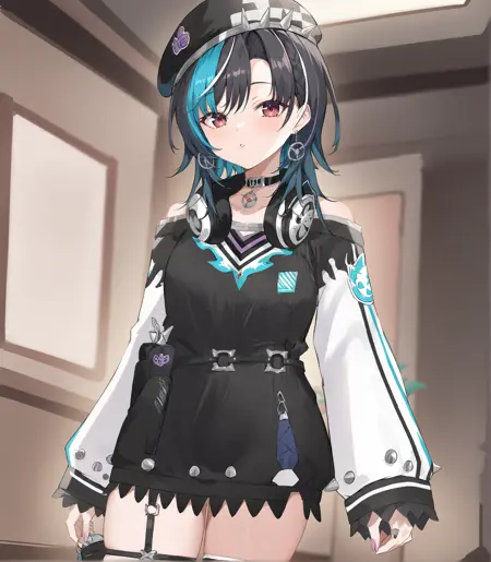 rindochihaya, o-ring 허벅지 스트랩, 옷에 글자, 베레모, 두꺼운 허벅지, 헤드폰,