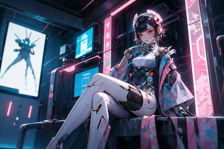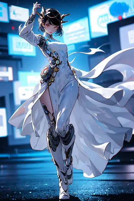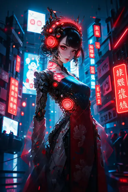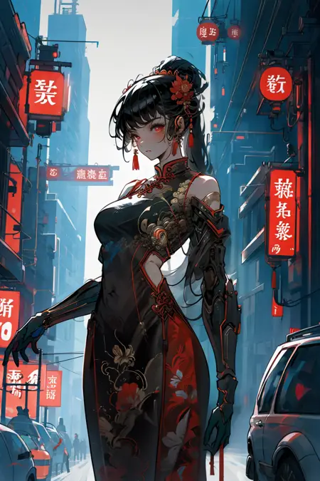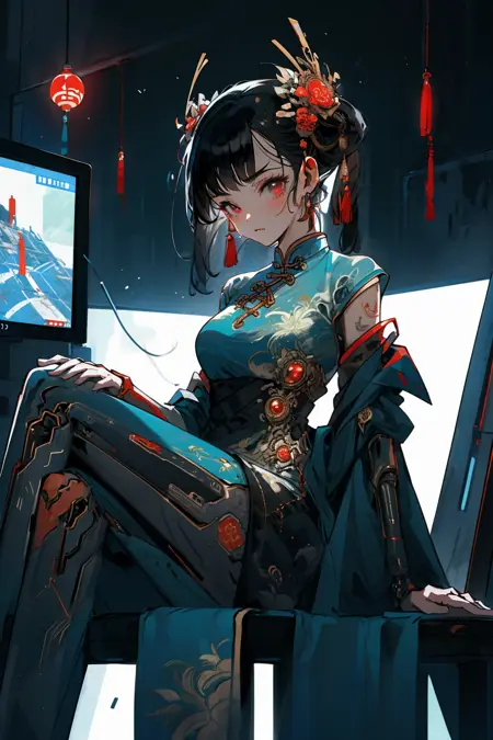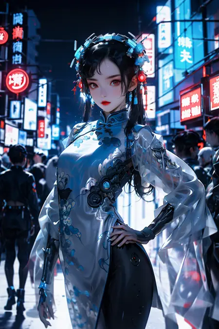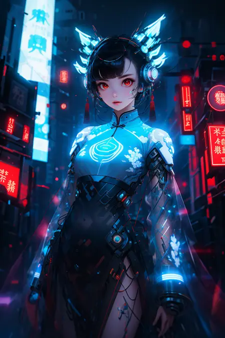 Cyber Chinese Style is a model combines traditional elements of Hanfu/cheongsam with futuristic cyber-mechanical elements, presenting a unique visual effect. In the painting of cyber Hanfu/cheongsam, traditional elements such as pleats, patterns, and accessories are combined with mechanical elements such as metal structures, electronic components, and dazzling lights, creating a unique futuristic style.