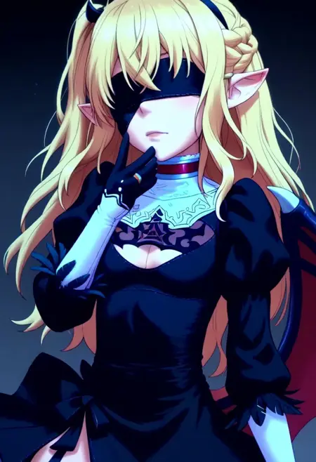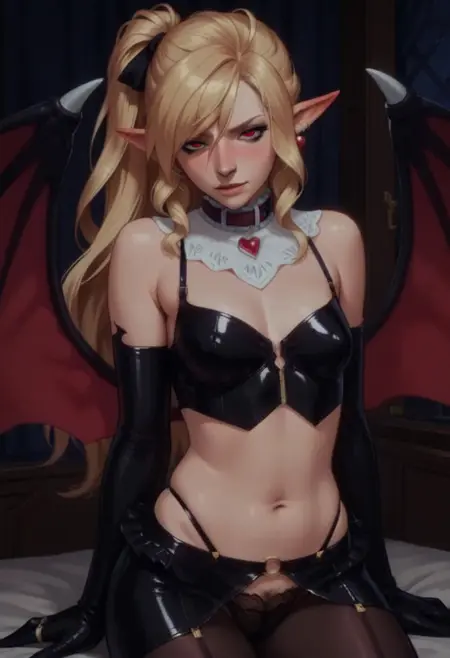 prompt: 1girl, Tiffany Lilystella, 金发, 单侧马尾, 红眼, 填充领口, 魔鬼女孩, 魔鬼尾巴, 尖耳, 褶边裙, 紧身带, 连裤袜, 肘部手套, 中指戒指, 翅膀, 肚脐, 小乳房, 成熟, 高挑, 内裤, 穿衣, 母性成熟女性, 年长, 乳胶靴, 身体绑带, 身体纹身,