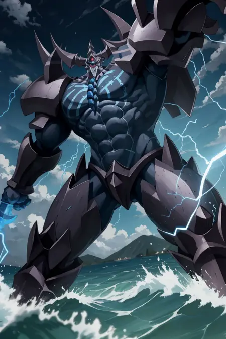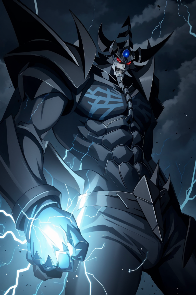 유용한 태그: obelisk_ygo, 1boy, 날개, 헬멧, 날카로운 이빨, 주먹을 쥔 손, 발톱, 몬스터, 전기, 번개, 디지몬(생물)