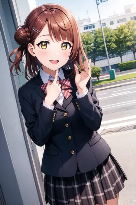 Tags you'll need: 1girl, solo, uehara ayumu, swept bangs, yellow eyes, hairpin,