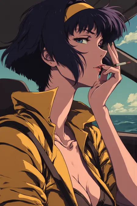보라색 머리카락, 90년대 애니메이션 스타일, 카우보이 비밥 스타일.