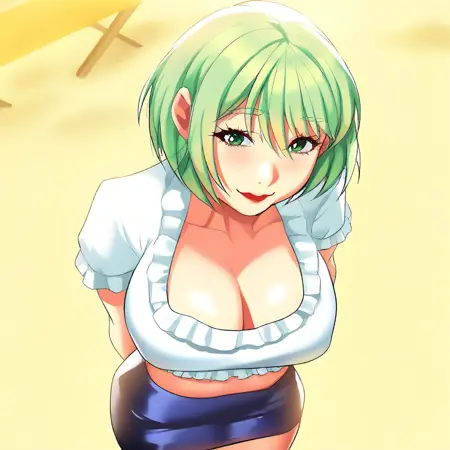 ユン・チェリ:yoon_che-ri、美しい緑の目、美しい緑の髪、美しいミディアムボブカット、前髪、巨大でふさふさした胸