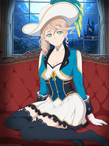 alisha diphda \(hyland royalty\), blonde hair, side ponytail, green eyes, dress, blue jacket, white skirt, thighhighs, gloves, white hat, hat feather, white choker