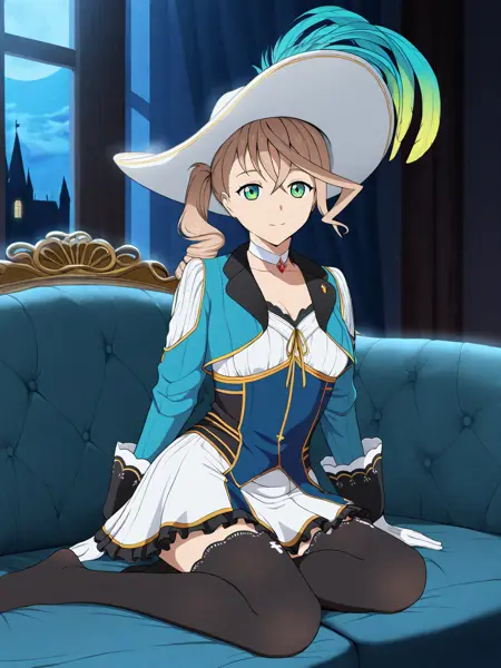 alisha diphda \(hyland royalty\), blonde hair, side ponytail, green eyes, dress, blue jacket, white skirt, thighhighs, gloves, white hat, hat feather, white choker