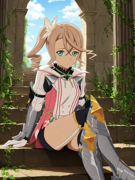 alisha diphda, blonde hair, side ponytail, green eyes, armor, neck ribbon, black shorts, garter straps, gauntlets, gloves, greaves