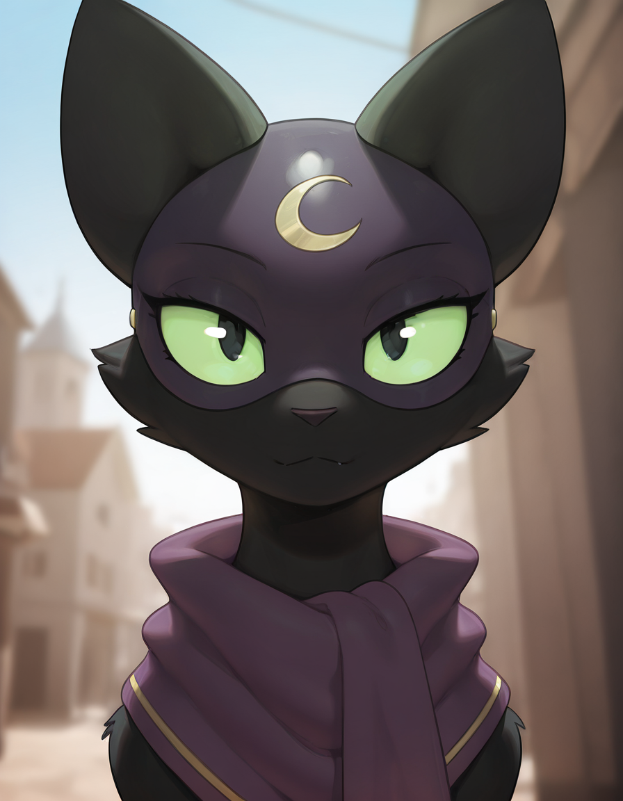 Helper tags: feral, cat, black body, purple mask, purple scarf