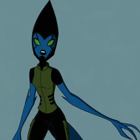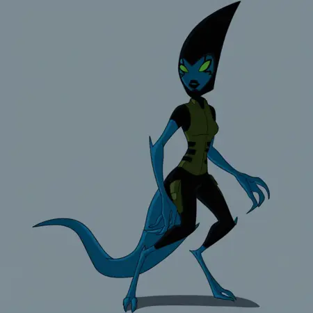 触发词:1girl,独奏,Kineceleran女性,Helen_B10AF,长椭圆尖锥形黑色头盔,绿色眼睛,蓝色皮肤,黑色嘴唇,黑色面部纹路,长卷曲蓝色尾巴,黑绿色制服,黑色球状脚,三指手
