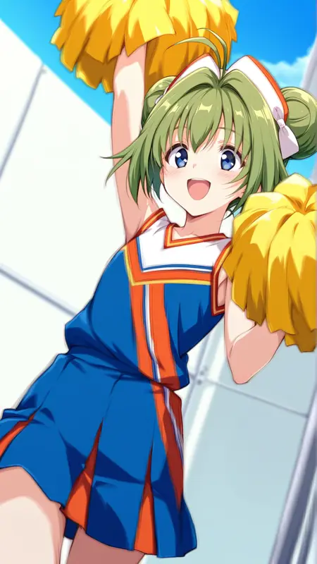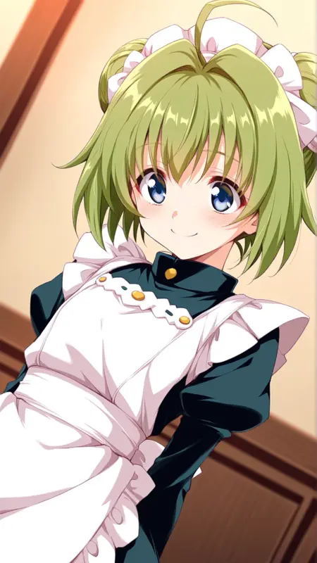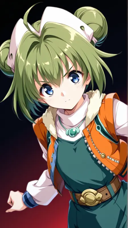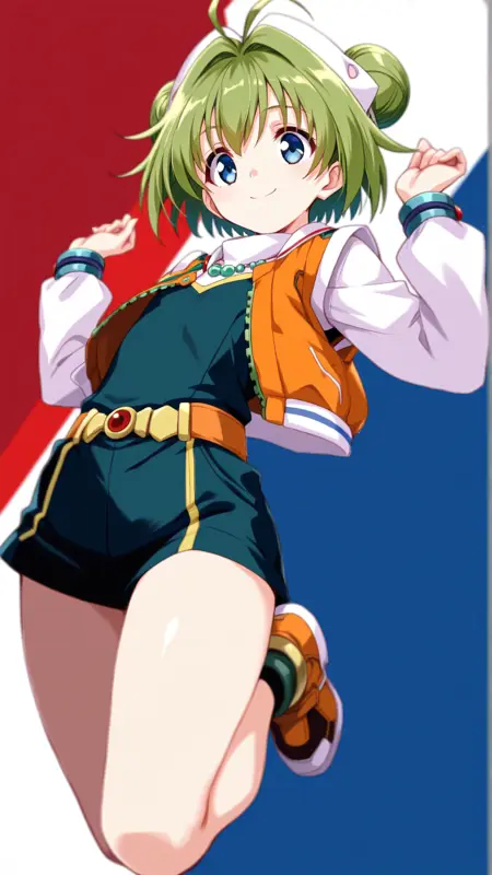 Appearance:blue eyes, green hair, short hair, hair bun, double bun, ahoge,antenna hair ,flat chest,