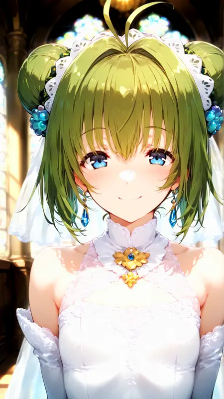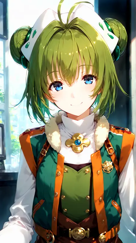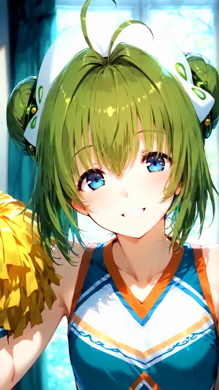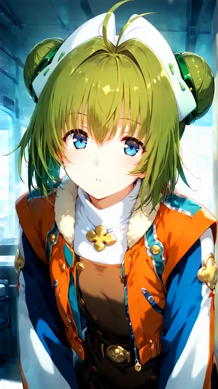 외모: 파란 눈, 녹색 머리카락, 단발, 머리 뾰족, 더블 뾰족, 아호게, 안테나 헤어, 평평한 가슴,