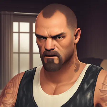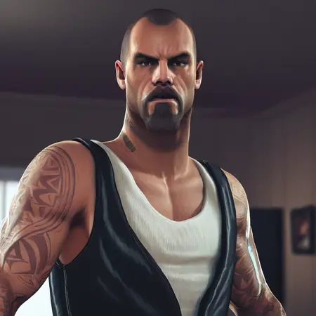 FrancisL4D, source_game, male, solo male, human, broad shoulders, mature male, brown eyes, muscular male, athletic build, sleeve tattoos, shaved head, very short hair, very short brown hair, goatee, mustache, facial hair, stubble, scruffy, tough, rugged, manly