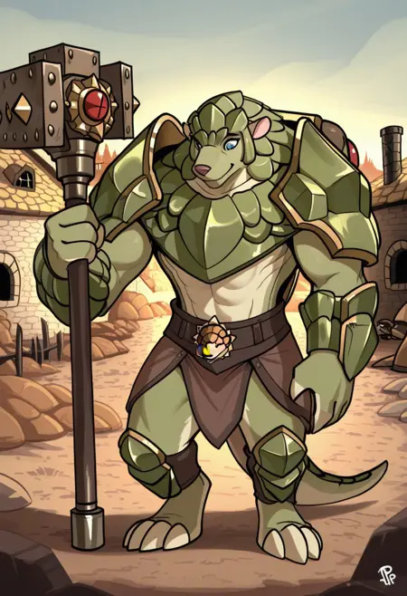 hamir, pangolin, male, green body, muscular, furry, blue eyes