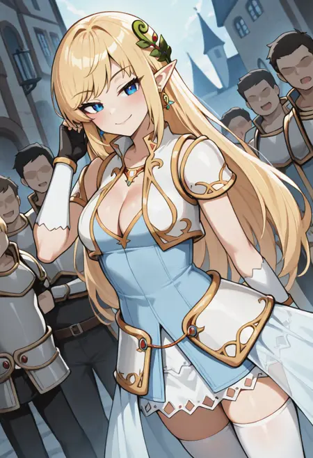 mercedes_elf,1girl,精灵,尖耳朵,金发,长发,蓝眼睛,胸部显露,中等乳房,过膝袜,连衣裙,绝对领域,盔甲,黑色手套,半指手套,发饰,耳环,珠宝,珊瑚发饰,