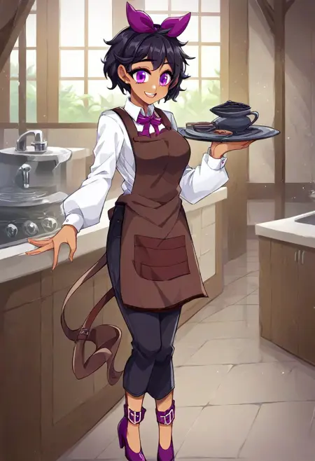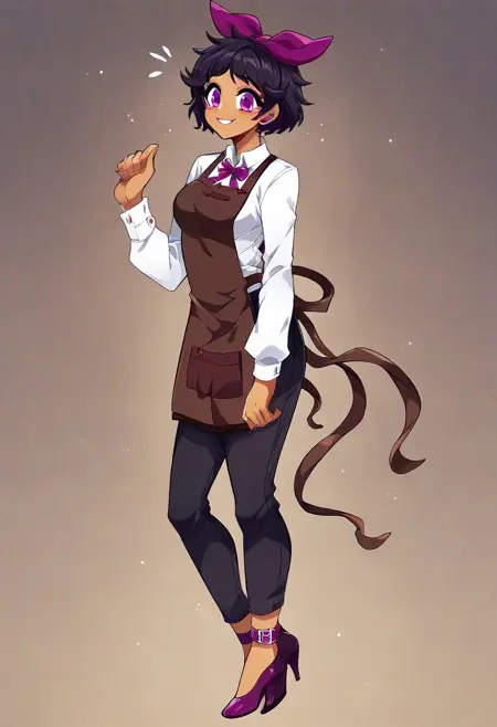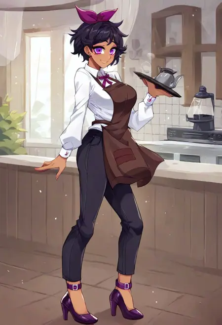 White-long-sleeved-shirt, black pants, purple-high-heels, brown apron,