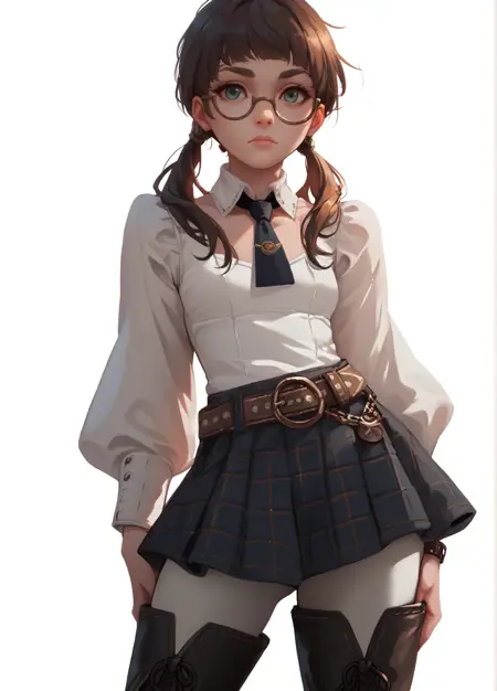 nieraccord, glasses, white shirt, necktie, long sleeves, black gloves, belt, plaid skirt, thigh boots
