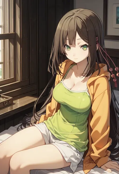 General tags: Shinonome Satsuki, Koichoco, brown hair, long hair, blunt bangs, side hair, red hair accessory, hair accessory with beads, hair accessory with tassel ends, green eyes, large breasts,