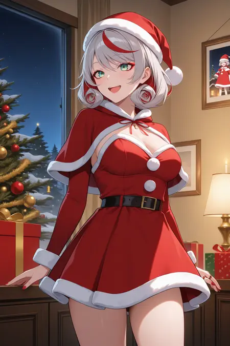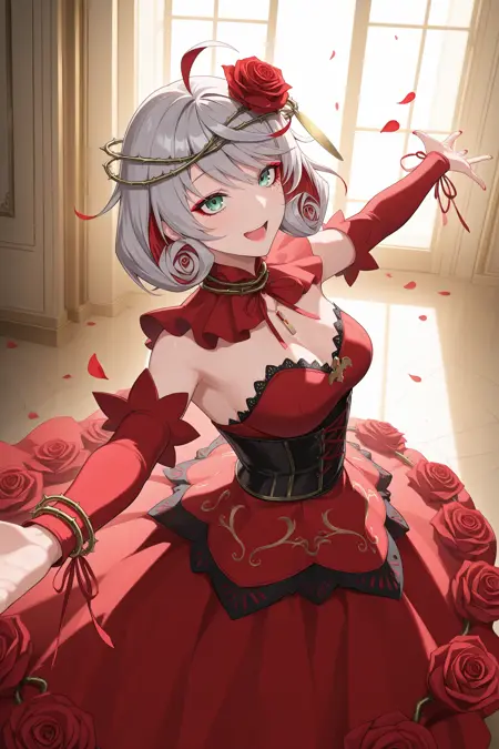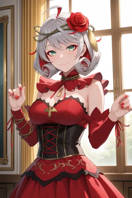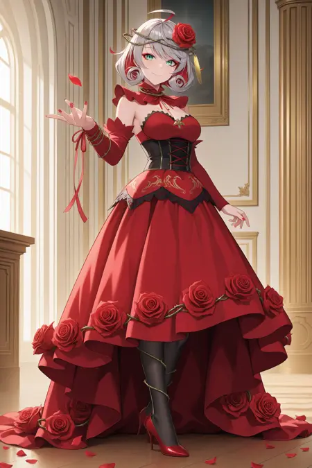 destiny (takt op.), anna schneider, multicolored hair, short hair, grey hair, red hair, ahoge, hair ornament, hair flower, crown of thorns, green eyes, makeup, red eyeshadow, mark under eye, red nails, red rings, rose, jewelry, necklace, dress, red dress, detached sleeves, black corset, black pantyhose, red highheel