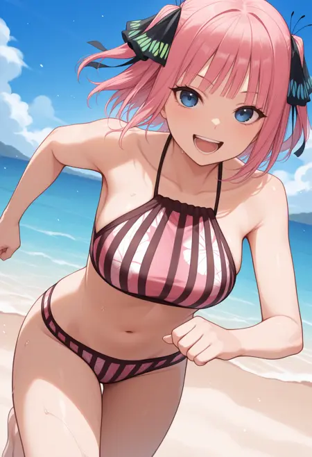 Bikini: n1n0bikini, short hair, pink hair, blunt bangs, two side up, butterfly hair ornament, hair ribbon, black ribbon, blue eyes, pink bikini, vertical-striped bikini, thighs, bare shoulders, collarbone, stomach, navel, large breasts