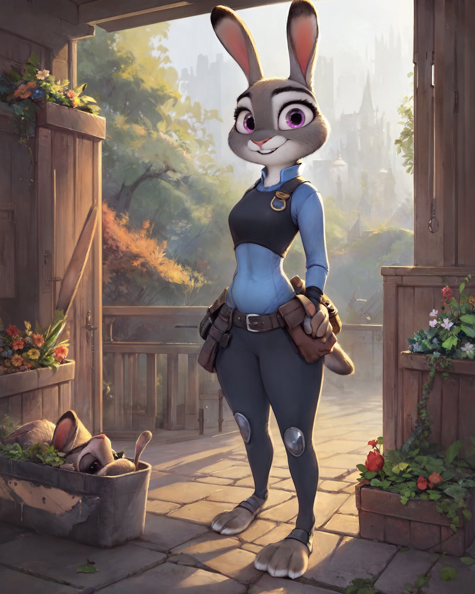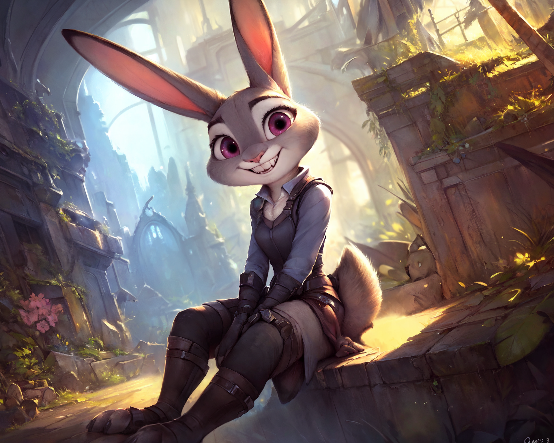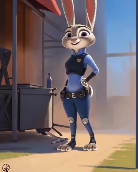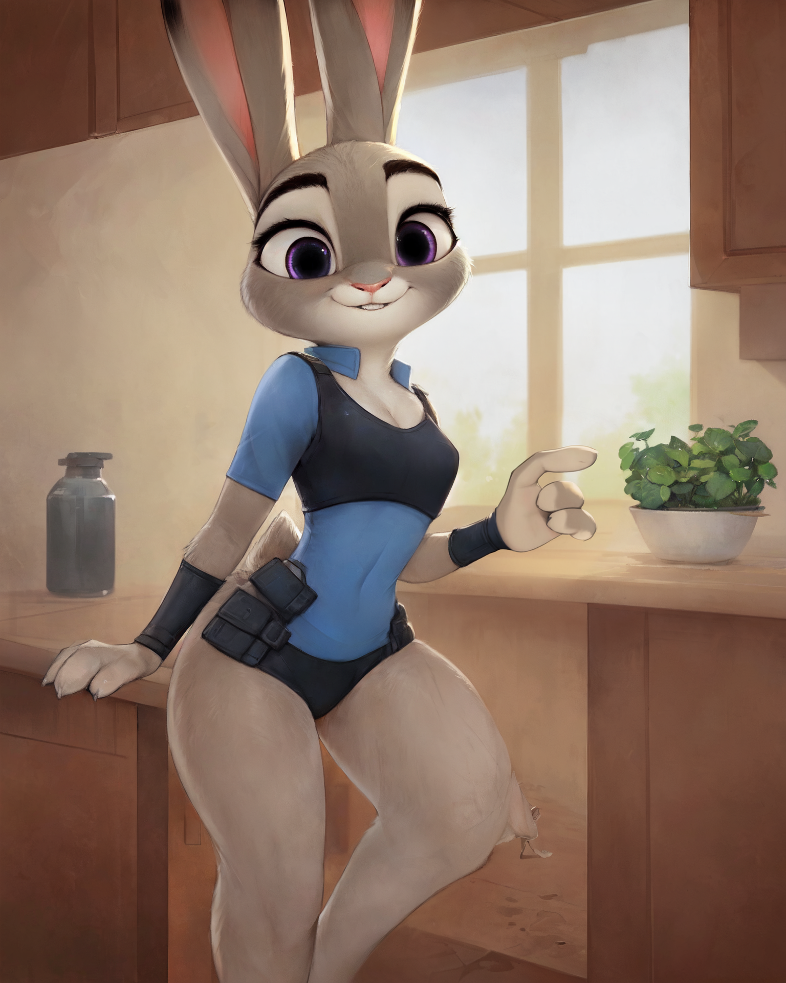 (by qupostuv35:1.2), female, (Detailed face), (solo:1.1), (more details:1.1), ((anthro, humanoid)), [(thin:1.1) : small petite : (Judy rabbit:1.2):4], (Detailed face), (anthropomorphic legs, anthropomorphic hands:1.1), (solo) lora:Judy\_V2.4:0.4 . . .