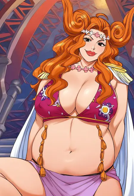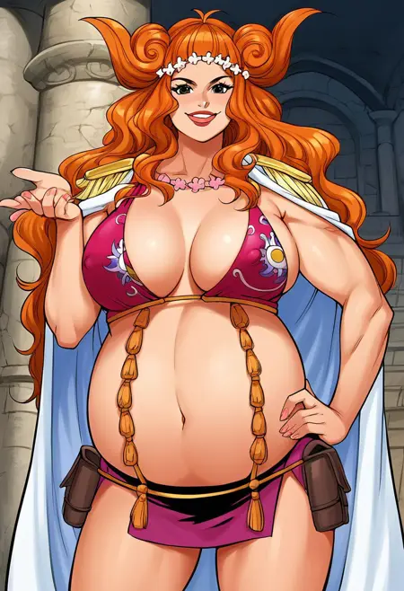 BoaMarigoldOP, 1girl, solo, chubby, fat woman, tall woman, muscular female, wave hair, curly hair, orange hair, hair ornament, very long hair, head wreath, black eyes, lips, red lipstick, huge breast, pink bikini, cleavage, large belly, navel, groin, loincloth, thick thighs, sumo wrestlers body type, boots, white cape, necklace, biceps, Kuja designs, epaulettes,