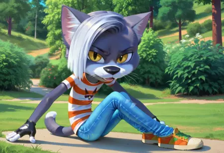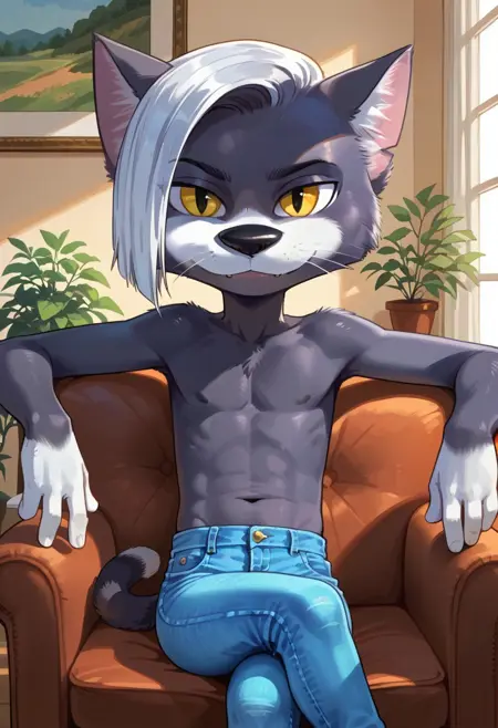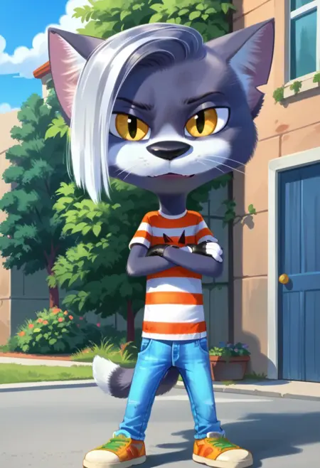 grey fur, grey and white haircut, cat ears, cat eyes, yellow eyes, cat tail, cat nose, black nose, white spot around the nose, white hands, white fur bundles in ears, four fingers on arms