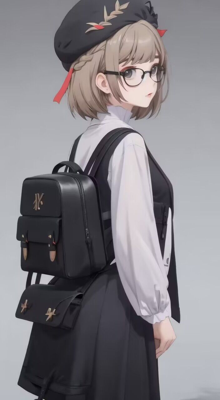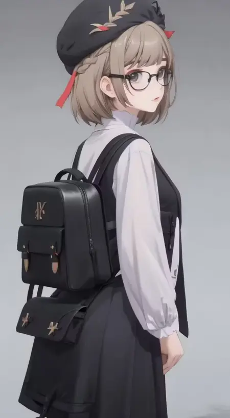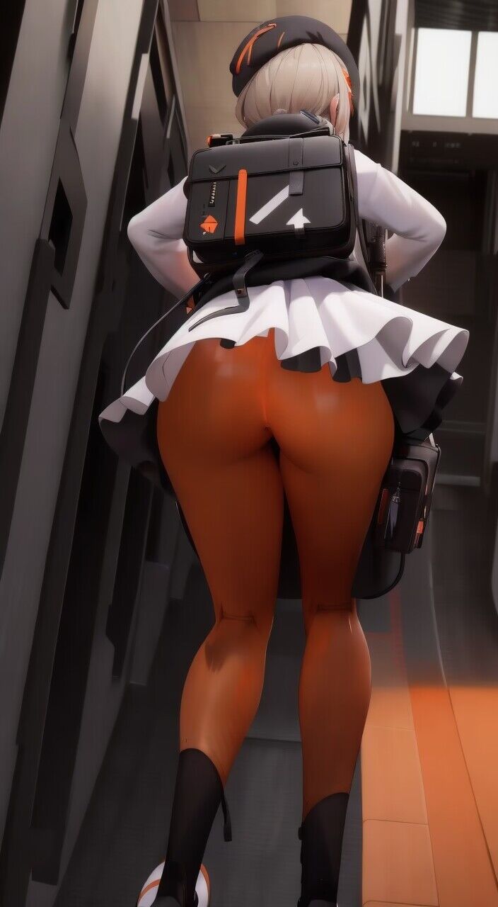 madeleine, black beret, backpack, white skirt, black frills, ass, orange pants, from below, from behind
