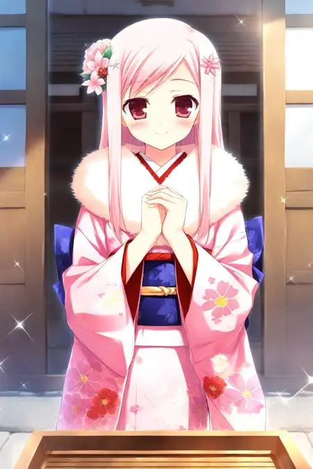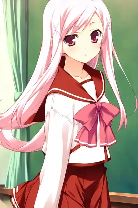キャラクタープロンプト:長い髪、ピンクの髪、流れている前髪、髪飾り、ヘアクリップ、赤い目