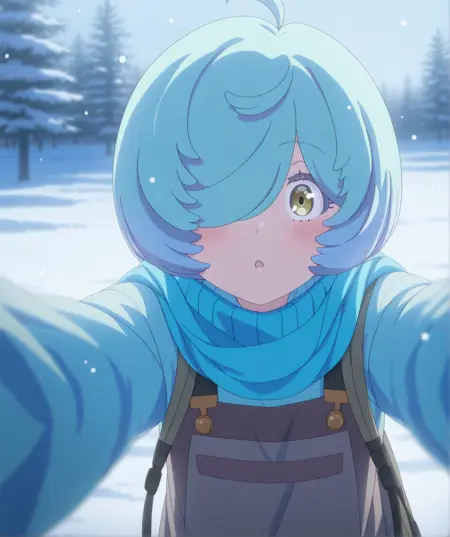 eyelashes, blush, short hair, bangs, green eyes, blue hair, hair over one eye, one eye covered, ahoge, aqua hair