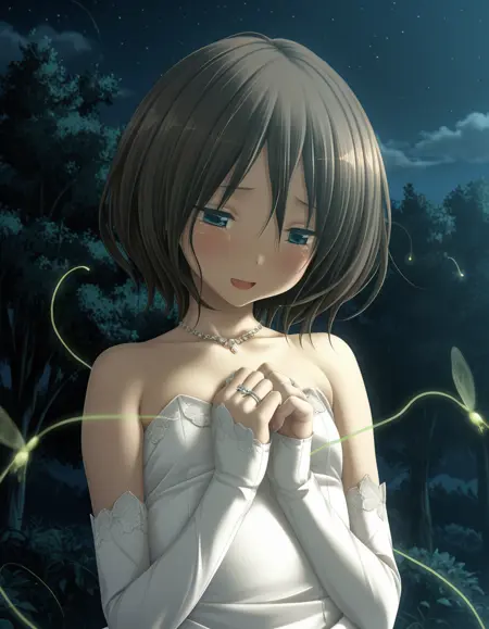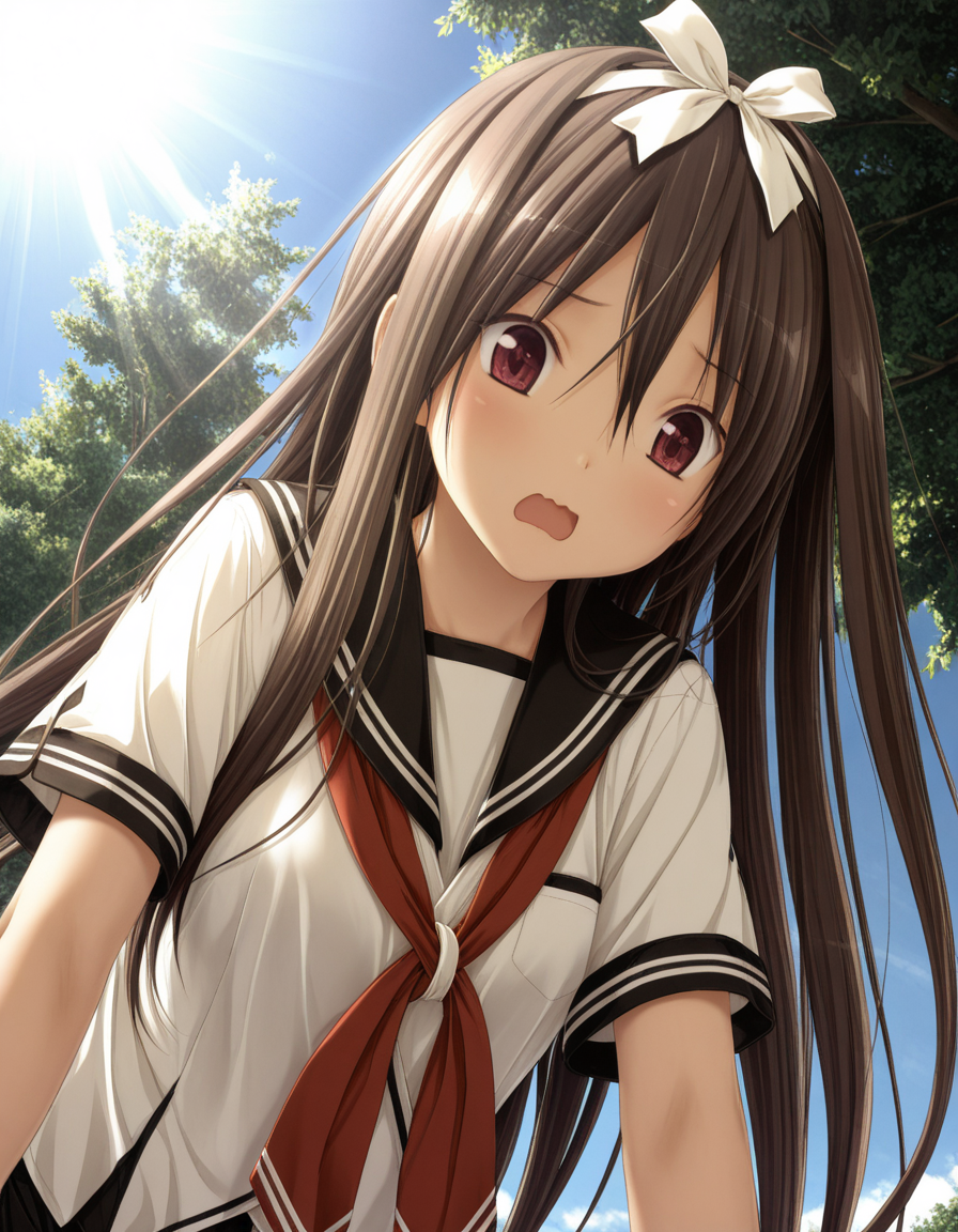 補助ワード: day, night, sunbeam, sunlight, sunset, sky, small/medium/large breasts(胸の大きさ), hair between eyes, hair ribbon, bow(VNの女性キャラクターはすべて何らかの髪リボンを着けています。他の頭部装飾と競合する場合はネガティブプロンプトに含めてください)