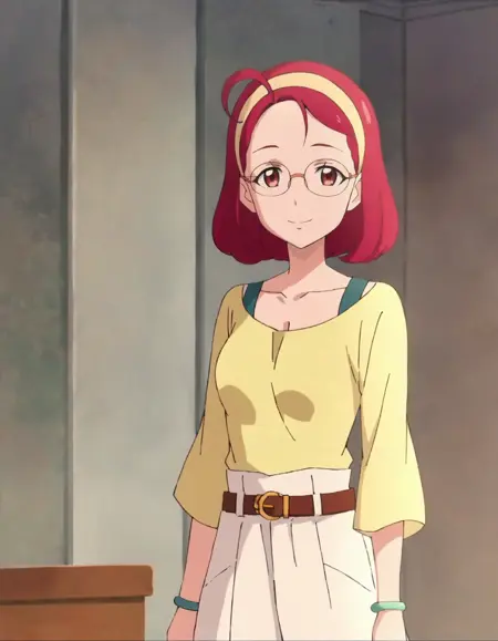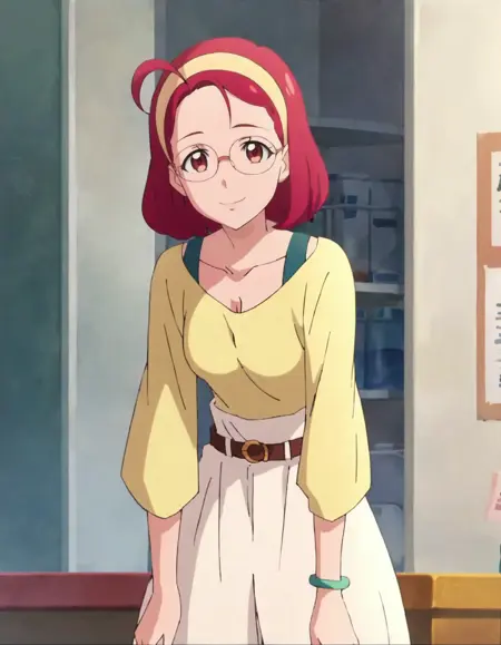 score_9, score_8_up, score_7_up, anime screencap, solo, 1girl, hoshinaterumi, glasses, hairband, belt, skirt, jewelry, long skirt, bracelet, shirt, short hair, yellow shirt, collarbone, long sleeves, lora:hoshinaterumi:0.8