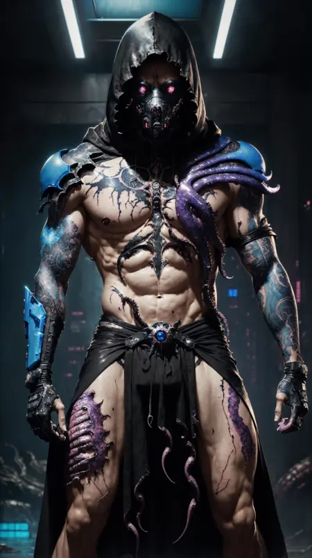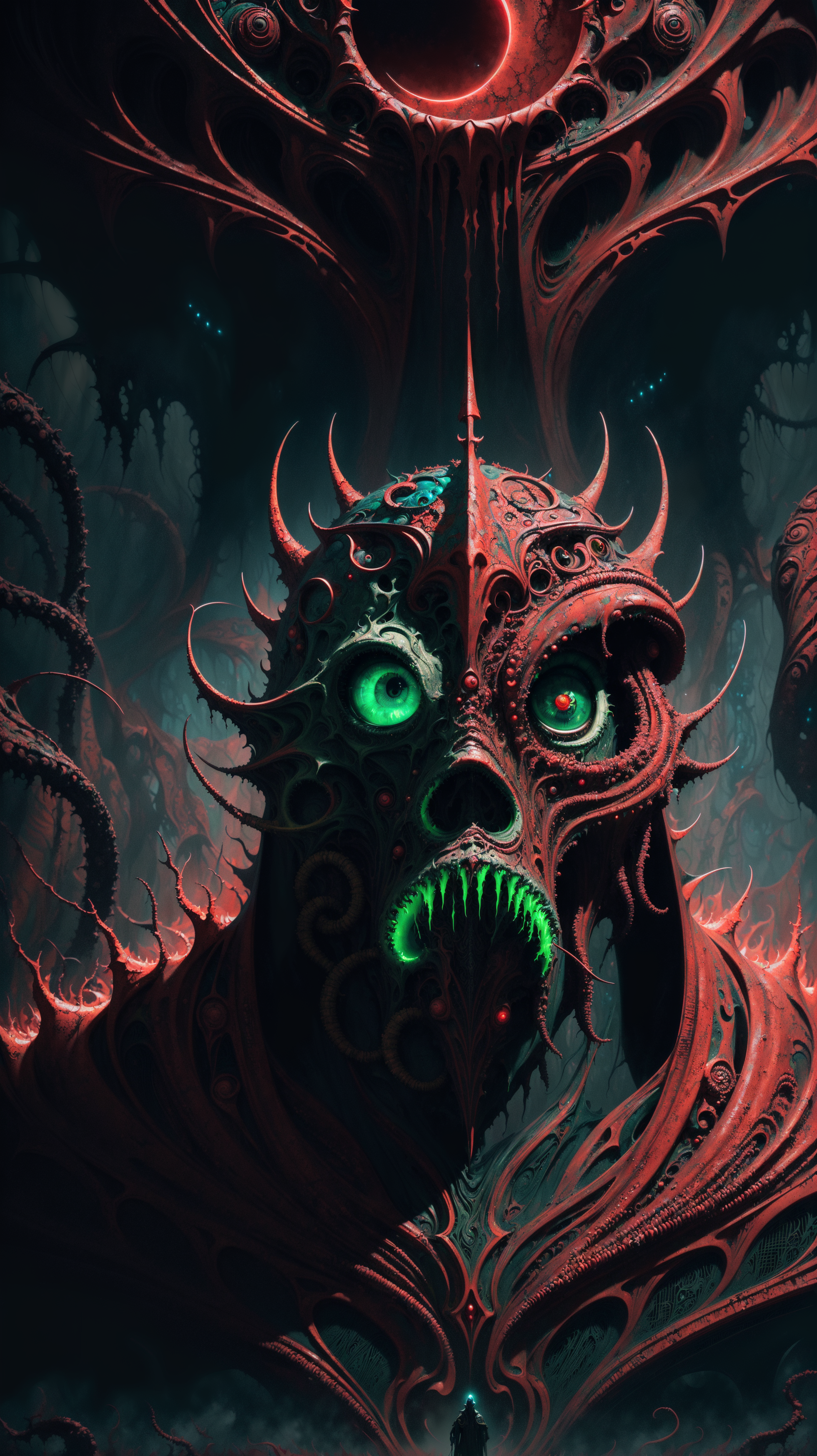 Recommended prompt: Cthulhu, lovecraft cthulhu, lovecraftian style, cult of cthulhu, gradient color, jungle, antichrist cross, Cross of Saint Peter, dynamic pose, sharp glowing eyes, green eyes, flams on eyes, flame eye, neon green eyes, (digital illustration, Duy Huynh ), Jackson Pollock (masterpiece, best quality, beautiful and aesthetic:1.2), cinematic, masterpiece, best quality, detailed, highest quality, ultra detailed, highres, cinematic light, splendid and colorful, out of focus, RAW photograph, art portrait, high contrast, colorful, highest details, neon color, red bloody veins growing and intertwining out of the darkness, oozing thick red blood, veins growing and pumping blood, vascular networks growing, connecting, explanding, red veins everywhere, zdzislaw beksinski, a mind flayer, (Muted colors:1.1), (Repetition:1.1), (Cross-hatching:1.1), (Infrared:1.2), Rust, Sphere, ultra detailed, intricate, oil on canvas, ((dry brush, ultra sharp)), (surrealism:1.1), (disturbing:1.1), beksinski style painting, sparks, lensflare, rim lighting, backlighting, Bracelet, RTX, Post Processing, satanic cross, (masterpiece, detailed, highres:1.2), zdzislaw beksinski, Giger style, beksinski style, satan cross, inverted cross, satanism, satanic symboles, satan himself, (body horror:1.4), (biomachine:1.3), (bloody:1.2), living being, (colorful:1.2), Hans Giger, many hands, (zentangle:1.2), (colorful:1.3),(masterpiece:1.2), best quality, original, extremely detailed wallpaper, highly detailed, extremely detailed, electric, (high contrast:1.1), (Reflected light:1.2), ultra detailed, dry brush, (surrealism:1.1), (disturbing:1.1), (cottagecore), (geometric:1.2), (futurism:1.2), impressionist, (detailed), (majestic:1.2), (breathtaking), (suggestive:1.3), (depressing:1.3), (cute:1.4), (enticing:1.4), (irresistible:1.4), disturbing, (fascinating:1.2), (magnetic:1.2)