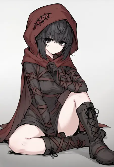 MirandaBS2, 1girl, solo, medium breasts, black hair, short hair, black eyes, expressionless, boots, cloak, hood, hood up, red hood, several belts, brown, black gloves, black dress,