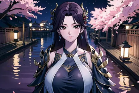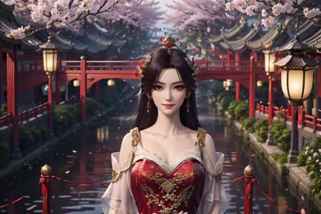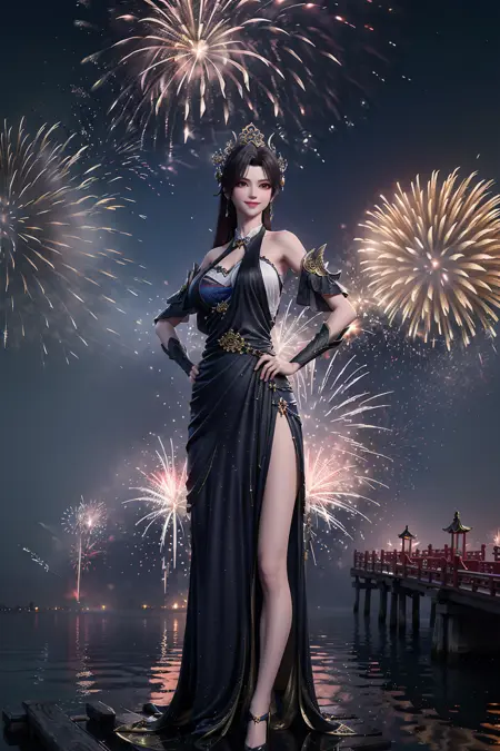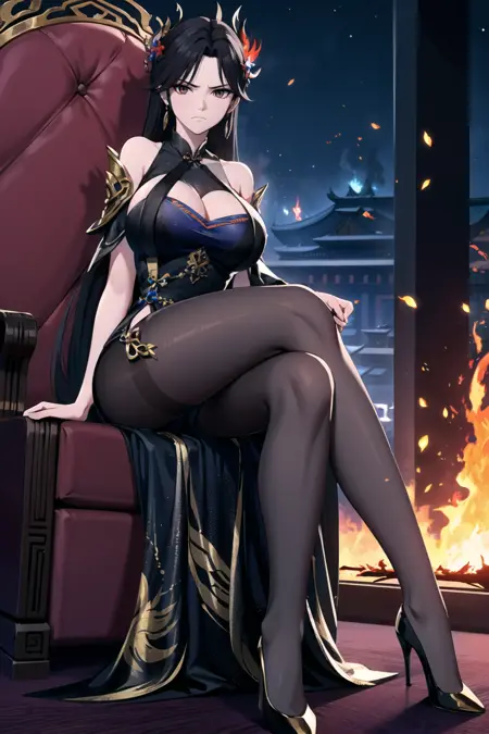 标签:1girl,solo,long hair,black hair,brown eyes,eyelashes,eyeshadow,makeup,red lips,hair ornament,jewelry,dress,earrings