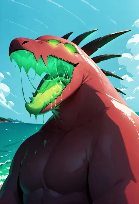 acrid, cuffs, multiple eyes, glowing eyes, saliva, glowing eyes, green eyes, green tongue, glowing mouth, glowing claws, glowing penis