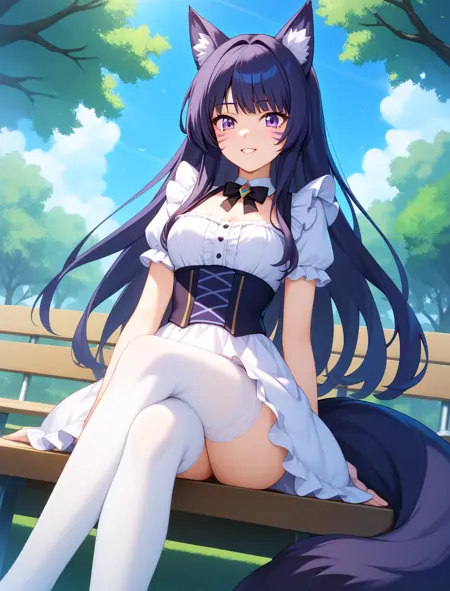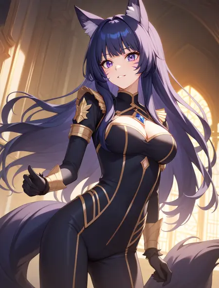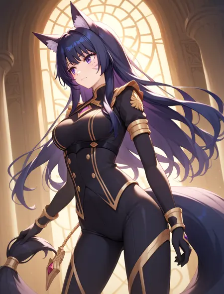 그림자 속의 에미넨스에서 델타. 꼬리, 얼굴 무늬와 같은 단어를 추가하는 것이 매우 잘 작동합니다. 옷은 검은 바디수트만 추가하세요.