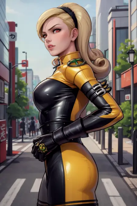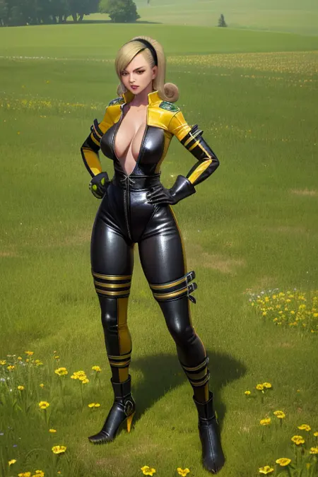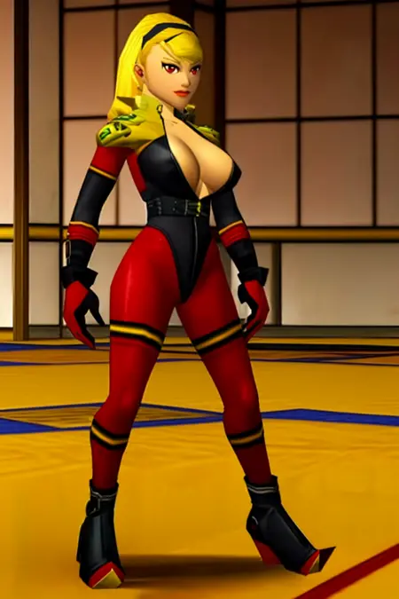 Other prompts : blonde hair, hairband, red eyes, bodysuit, breasts, unzipped center opening, cleavage, gloves, boots, high heels