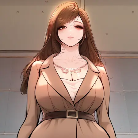 ((ベージュのトレンチコート、ブラウンベルト、ホワイトトップ、過剰な胸元、巨大な胸元、シルバーネックレス) + ブラックペンシルスカート)