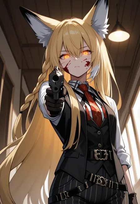 트리거 + 외모: vulpisfoglia, 여자 여우, 긴 머리, 금발, 눈 사이의 머리카락, 땋은 머리, 동물 귀, 동물 귀 털, 주황색 눈