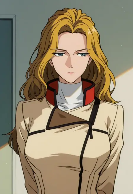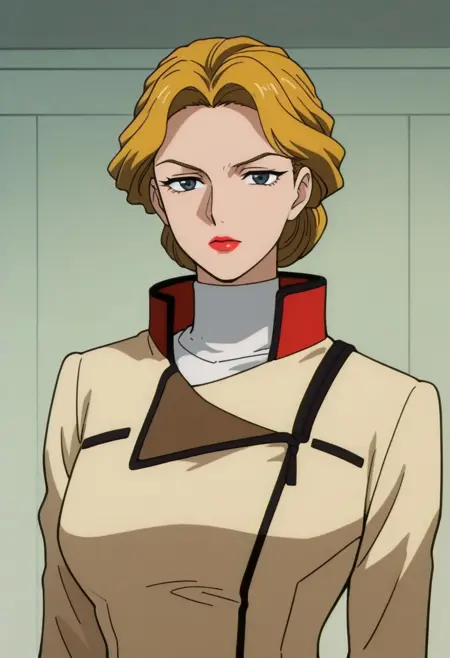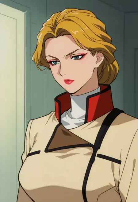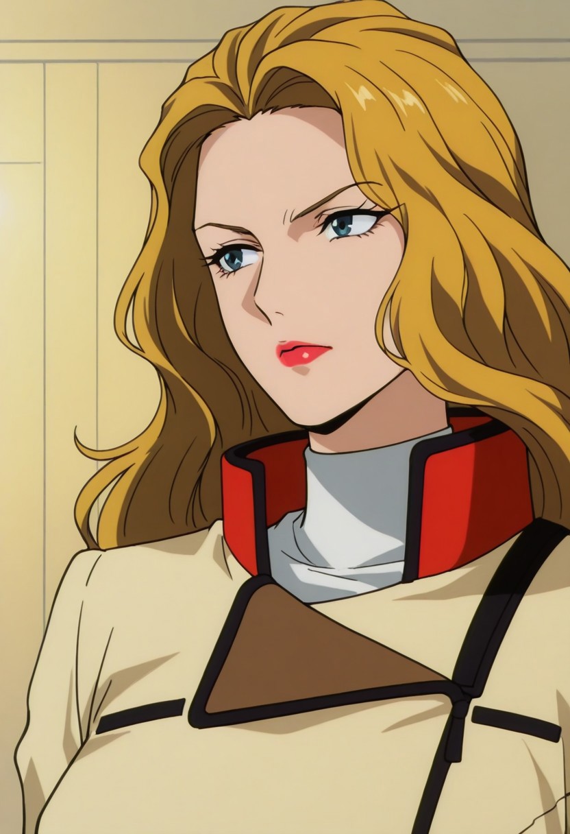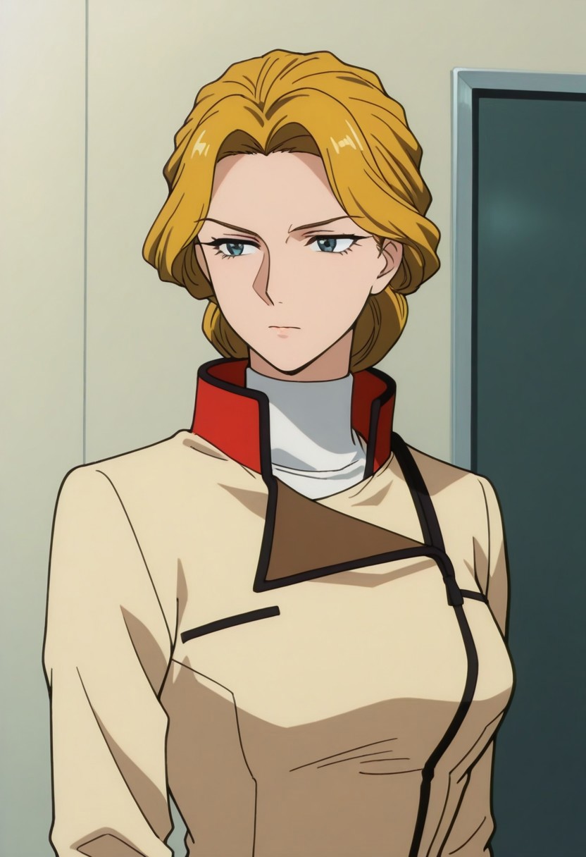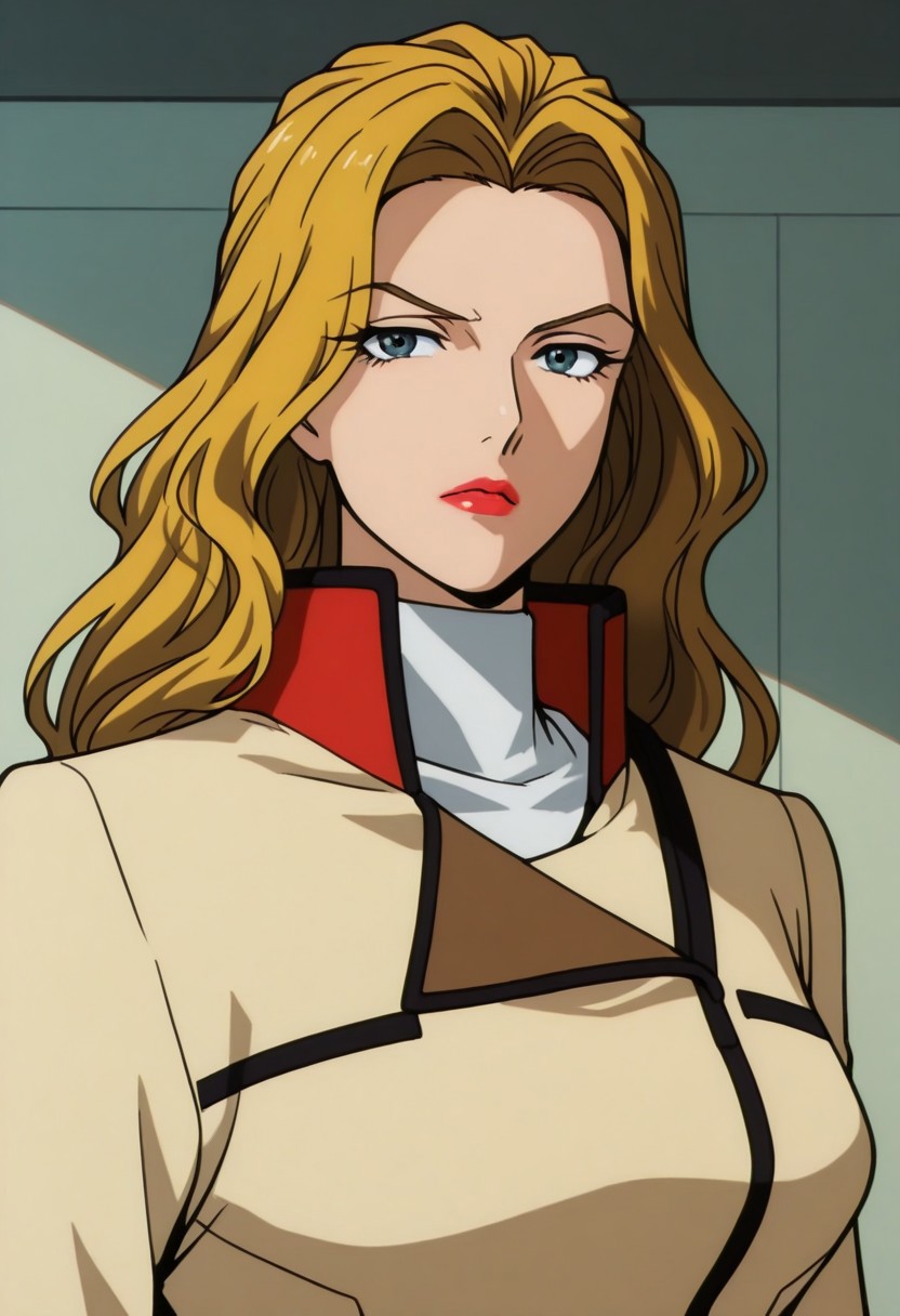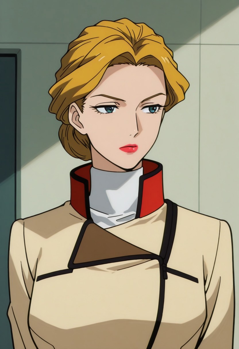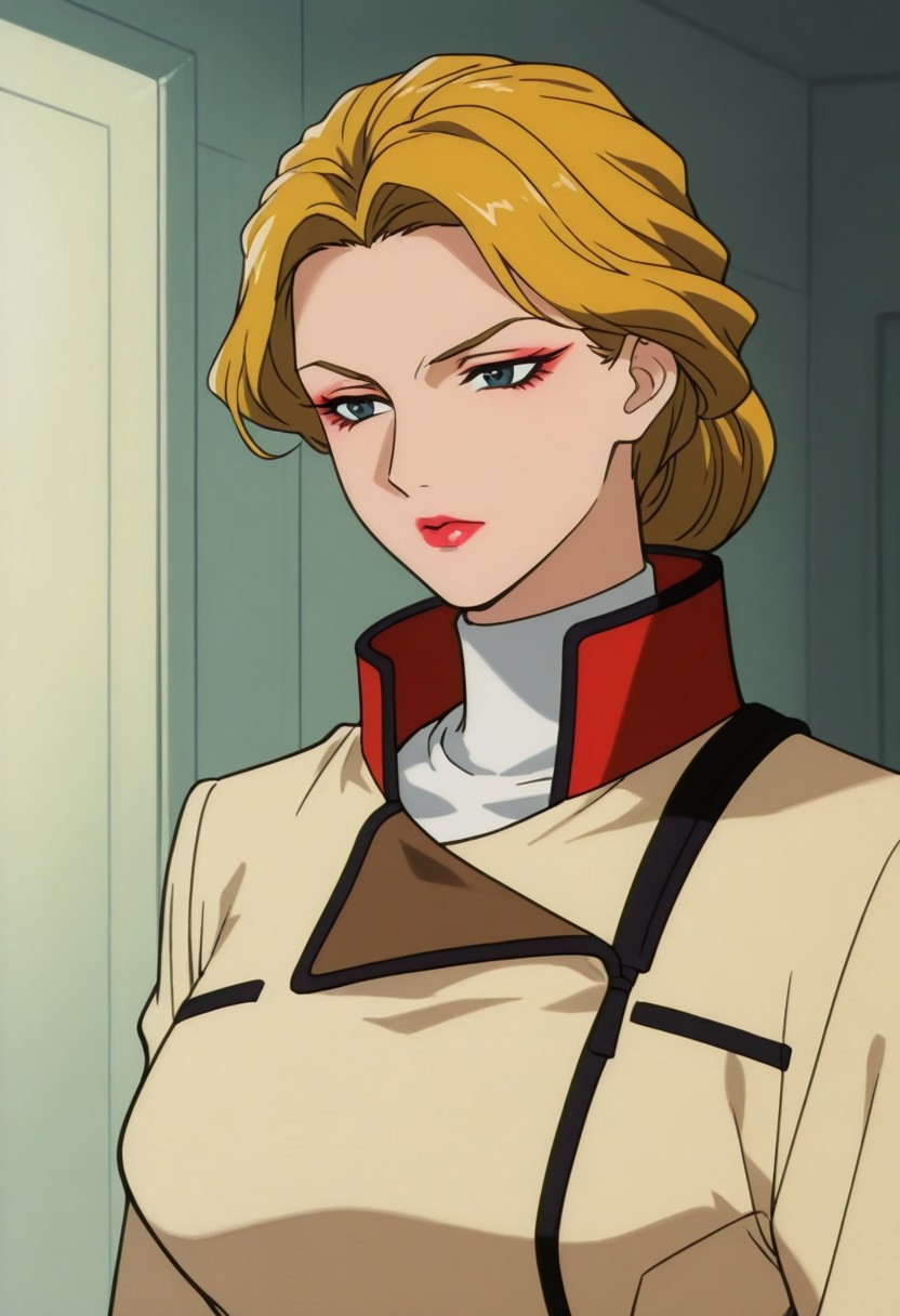 anoamc, 1girl, solo, blue yes, blonde hair, hair bun, lipstick, uniform, military, military uniform, shirt, white shirt, turtleneck, jacket, belt, skirt,