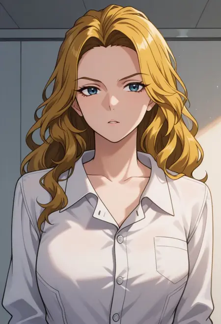 anoamc, 1girl, solo, blue yes, blonde hair, long hair, shirt, white shirt, buttons, skirt,