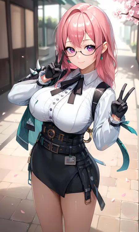 カラーリングシャツ、長袖、フリル付き袖、黒い手袋、肩アーマー、黒いリボン、ハイウエストスカート、ペンシルスカート、黒いスカート、黒いハイヒール、耳飾り