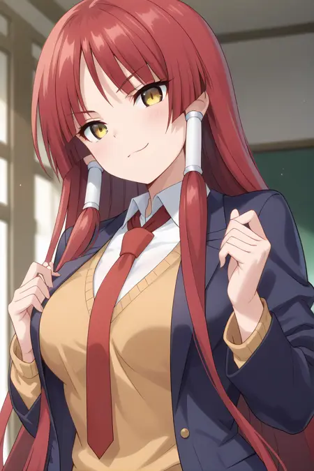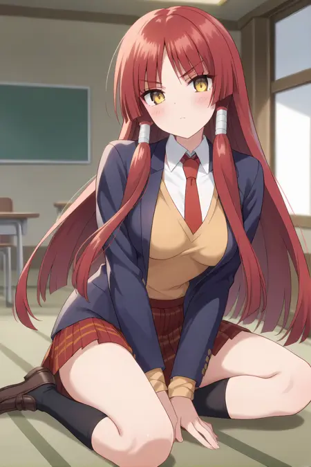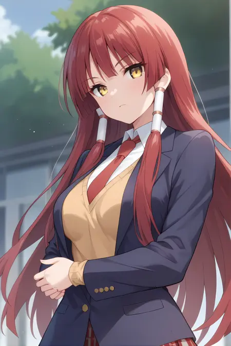 校服西装、白衬衫、黄色毛衣、红色领带、红色短裙