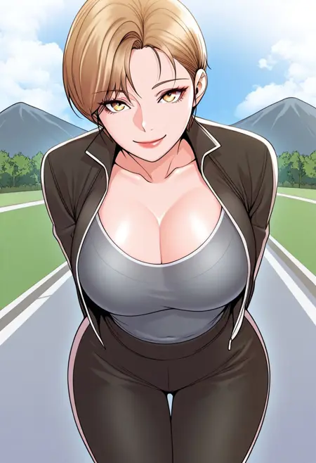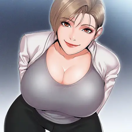 Seon Choi: seon_choi, beautiful amber eyes, beautiful light brown hair, beautiful short hair, huge and shaggy breasts,