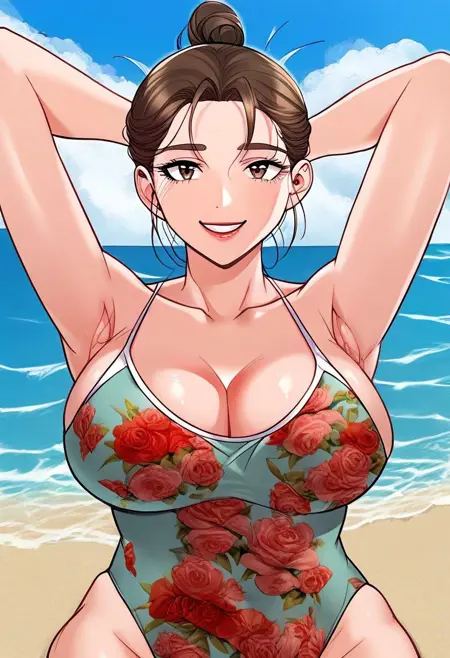 Lee Ah-Reum: lee_ah-reum, piercing brown eyes, beautiful brown hair, ponytail, bangs, huge and shaggy breasts,
