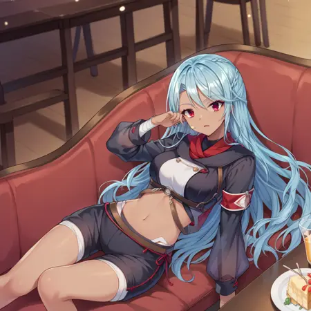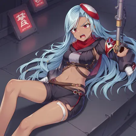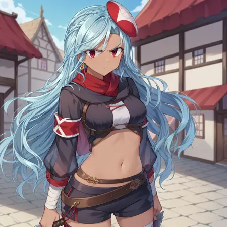 trisha, trishanormal, navel, long hair, dark skin, red eyes, dark-skinned female, midriff,
